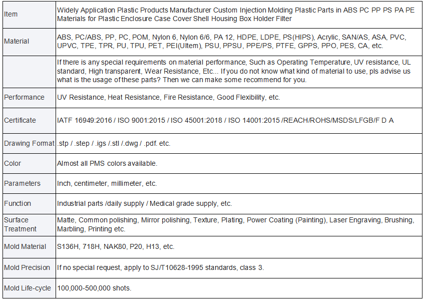One-stop Custom Plastic Injection Service In order to quote you as soon as possible, please provide us the following information together with your inquiry. 1) Detailed drawings (CAD/PDF/DWG/IGS/STEP/JPG) 2) Materials required 3) Surface treatment 4) Quantity (per order/per month/annual) 5) Any special demands or requirements, such as packing, labels,delivery,etc.